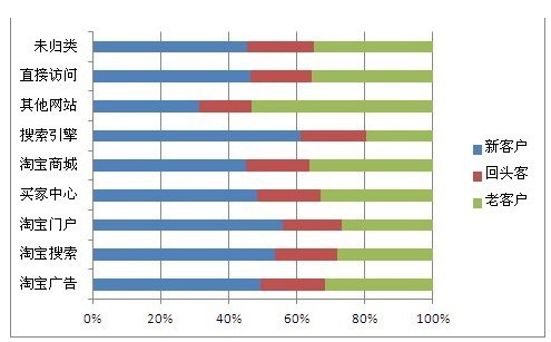 從上述圖表中,我們可以看到賣家一周內(nèi)的新客戶、回頭客、老客戶都是從不同的來(lái)源進(jìn)入網(wǎng)店的?;蛟S因搜索排名、口碑、品牌、商品展示等因素影響了消費(fèi)者的首次購(gòu)買行為。細(xì)心的朋友會(huì)發(fā)現(xiàn),在上表中,回頭客、老客戶是店鋪流量的主力軍,但他們的來(lái)源又各不一樣,從其他網(wǎng)站、商城、直接訪問、買家中心來(lái)的老顧客占得較多,而且質(zhì)量也比較高。